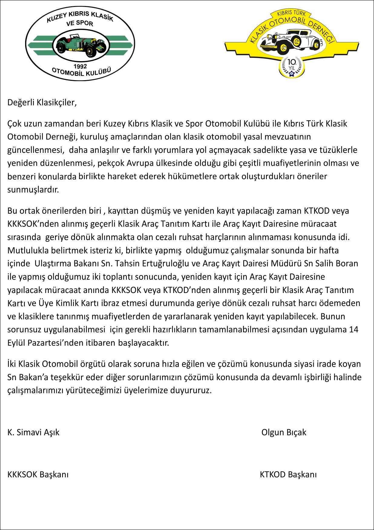 Değerli klasikseverler ve üyelerimiz. Uzun zamandan beridir iki sivil toplum örgütü olan Kıbrıs Türk Klasik Otomobil Derneği ve Kuzey Kıbrıs Klasik ve Spor Otomobil Kulübünün ortak çalışmalarımız sonucu olarak , klasik araç sahiplerini ilgilendiren birçok sonuca ulaşmış bulunmaktayız. İki örgütün girişimleri ve ısrarlı çalışmaları sonucunda ,Sn. Hasan Taçoy döneminde atılan ilk adımların , Ulaştırma bakanımız Sn .Tahsin Ertuğruloğlunun destekleri neticesinde bazı sorunlar çözüme kavuşmuştur. Bizler KTKOD ve KKKSOK olarak Araç Kayıt Dairesi Müdürü Sn. Salih Boran ve Sn. Tahsin Ertuğruloğlu nezninde gerçekleştirdiğimiz son toplantı neticesinde varılan bazı konular sonucunca bazı önemi problemler ivedilikle çözülmüş , birçok konu da yakın zamanda çözülmek üzere çalışmalarımıza derhal başlamış bulunmaktayız. İlk olarak kayıttan düşmüş ” klasik” kapsamındaki araçlarımızın KTKOD veya KKKSOK ‘ a ait , tazelenmiş üye kimlik kartı ve araç tanıtım kartlarını ibraz etmek koşuluyla 14 Eylül 2015 tarihinden itibaren geriye dönük harç ve vergilerinin tüm birikmiş faizleriyle birlikte ”alınmayacağının” sözünü aldık.